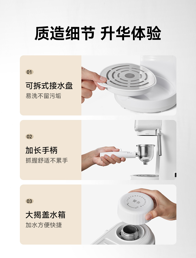 独立咖啡壶,随时取饮,旋钮式简单操作,可拆卸水盘、加长手柄、大揭盖水箱: