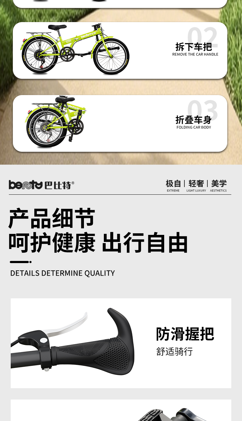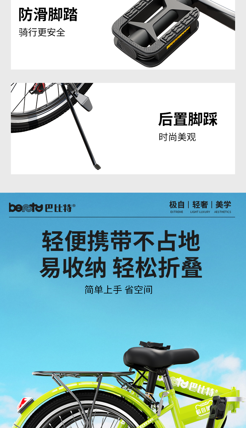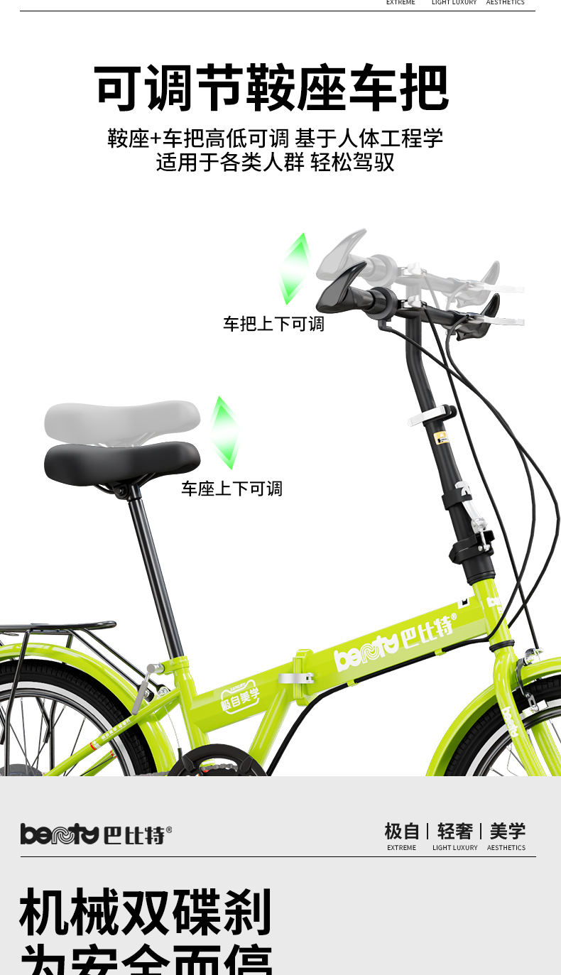 高碳钢车架,重量轻,刚性强,不易生锈,符合人体工程学设计,骑行更舒适健康,轻便好提,快速折叠,安装方便,刹车系统,手感舒适,安全性能好。