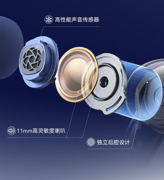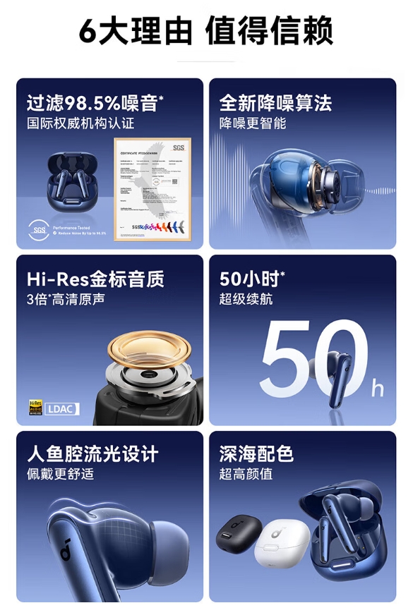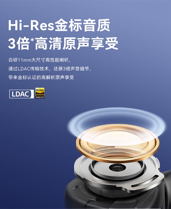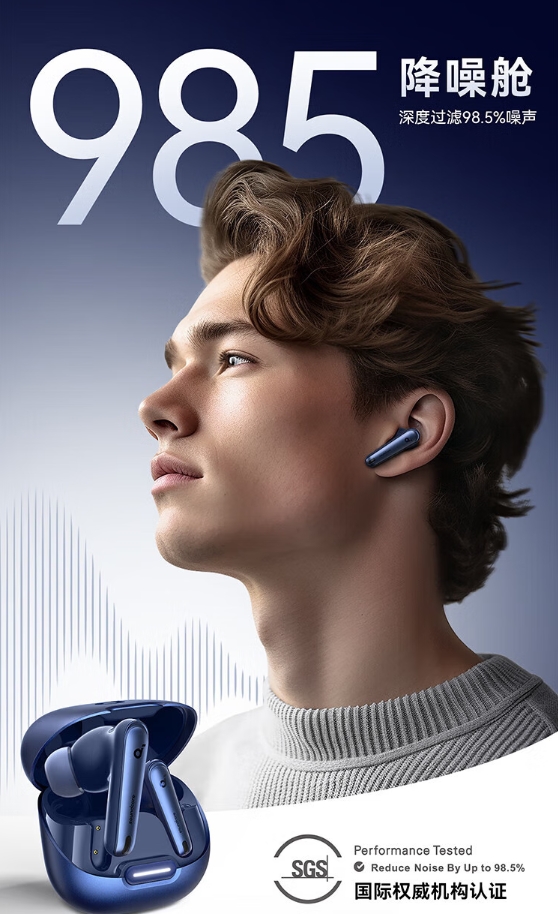 SGS国际权威机构认证,深度过滤98.5%噪音,智能降噪算法,全场景匹配,Hi-Res金标音质,3倍高清原声,50小时超长续航,人鱼腔流光设计,佩戴更舒适。