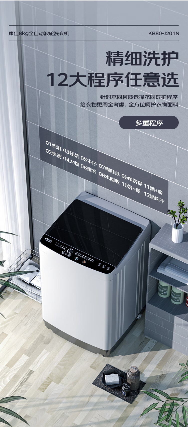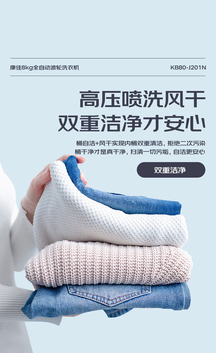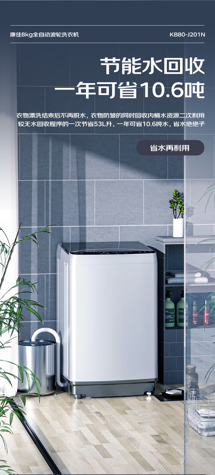 12大洗护程序+10段水位+8kg容量智慧搭配、定制洗涤方案,满足不同需求, 快洗提速17.4%,升级19分钟快洗高效洁净,省时省水,节能水回收利用,一次节省53L,一年可省10.6吨,相当于561桶桶装纯净水,省电20%省水9%,省电省水,环保节能,10年节约用电量可多洗500次,双重桶洁净风干,内外壁双重洁净,风干减少衣物含水量21%