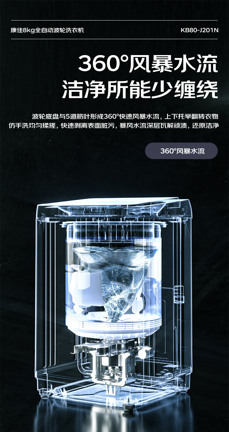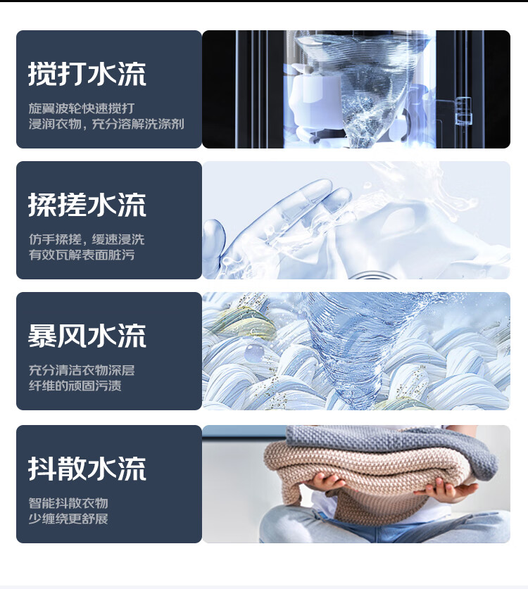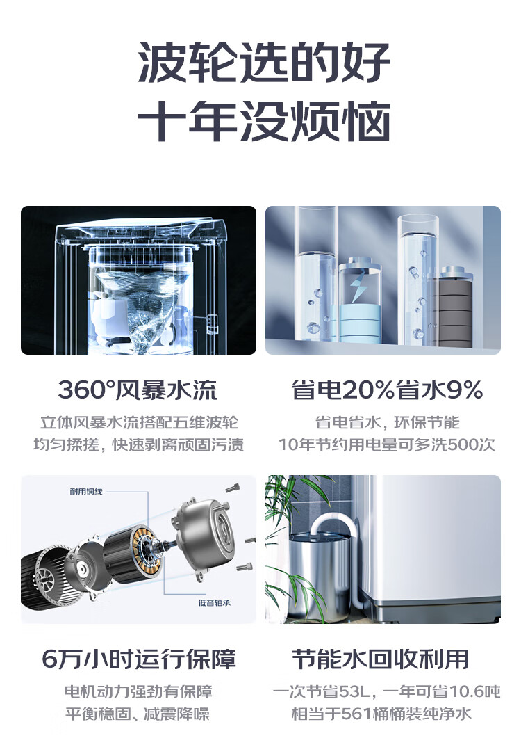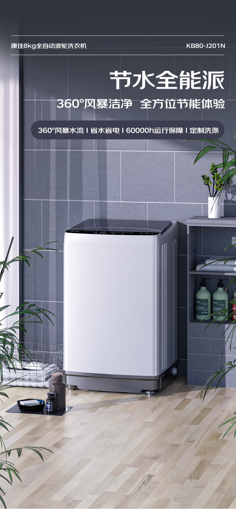 12大洗护程序+10段水位+8kg容量智慧搭配、定制洗涤方案,满足不同需求, 快洗提速17.4%,升级19分钟快洗高效洁净,省时省水,节能水回收利用,一次节省53L,一年可省10.6吨,相当于561桶桶装纯净水,省电20%省水9%,省电省水,环保节能,10年节约用电量可多洗500次,双重桶洁净风干,内外壁双重洁净,风干减少衣物含水量21%