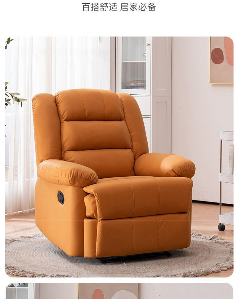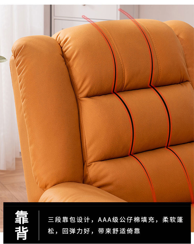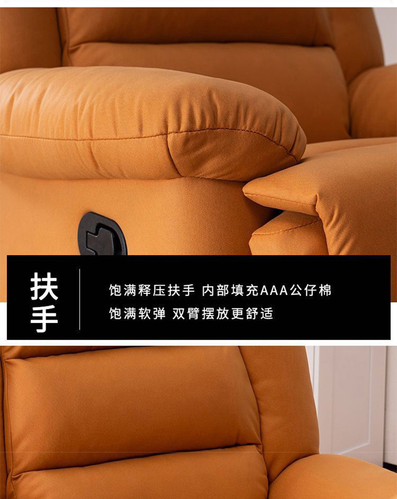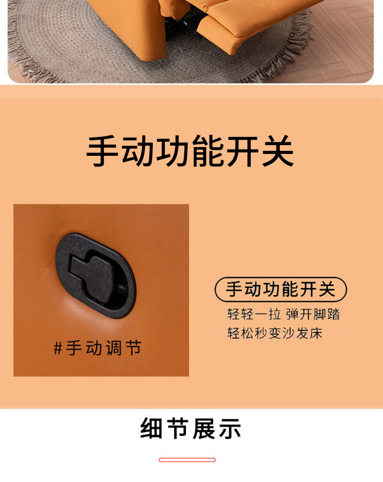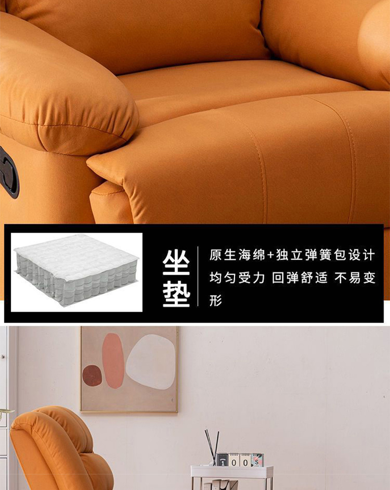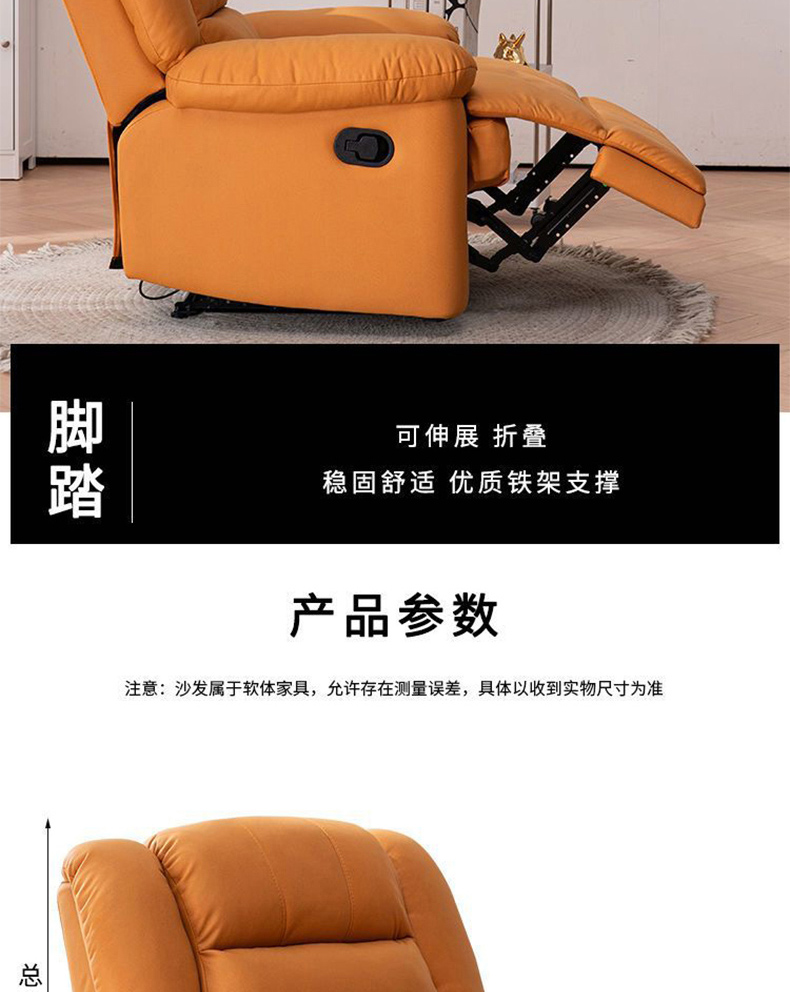新升级款科技布,耐磨耐蹭易打理;靓丽炫酷阳光橙,让人眼前一亮;手动款可手动放平,角度固定,坐起后靠背自动归位,搁脚靠双腿收回;深层凹陷,柔软舒适;内物由高密度海绵填充,仿佛开启零重力。